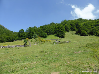 Partimos del pueblo allerano de Ríu Aller -un poco antes de llegar a él (760m) - y por un marcado sendero atravesando las cabañas de Los Collaos y de Porcareta, subiendo por un frondoso hayedo, nos aupamos al Mayáu Braniel.la (1.450m). Continuamos ascendiendo por una llomba hasta alcanzar los 1.847 m. y comenzamos a descender por la Val.lina Arbás hacia las cabañas de Les Cuayes (1.510m) y de Los Ánimos (1.430m) para desembocar en la hermosísima Braña Foz (1.340 m) donde paramos un rato a reponer fuerzas.