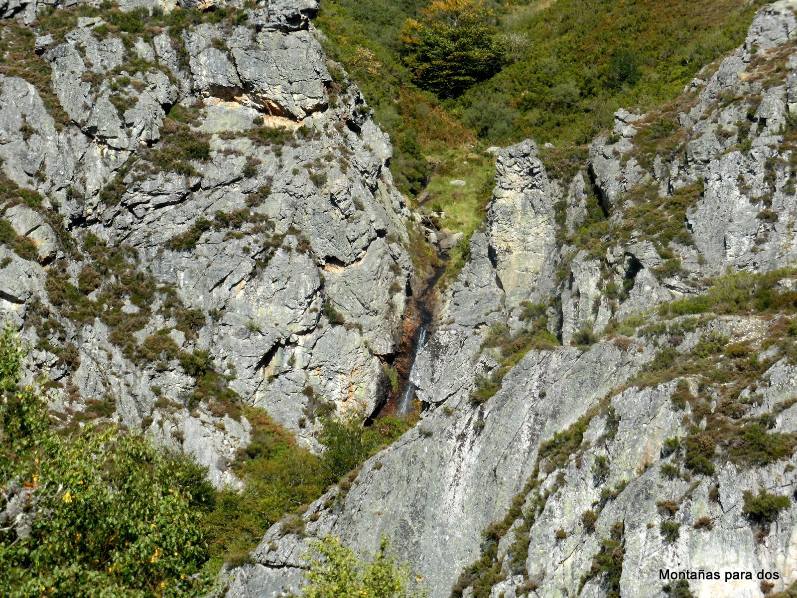 Decicimos desandar el camino hasta La Campona y continuar por la Fuente y la Casa Vieya, El Navayó, y por la Sienda'l Monte cruzar el Ríu Taío y comenzar el ascenso de La Sienda La Tabierna alcanzando la Fo'l Rofrenu con su disminuido Pingarón en esta época del año. El camino labrado buena parte de él en roca cuarcítica, tenía tramos realmente tan resbaladizos que nos hacían recorrerlo con extrema precaución. Llegamos al punto en que el PR se dirige a La Tabierna, punto en el que nosotros giramos a la derecha , y entre piornales , siguiendo las zonas más limpias , llegamos a encontrar un embarrado sendero que rodeando unos ejemplares magníficos y enormes de acebo , nos depositaron el la Col.lá Peornosa (1.381 m), con su bebezón . Comimos algo allí, y como ya eran las dos y pico, decidimos desandar de nuevo parte del recorrido , volver a la Fo'l Rofreno y descender hasta el entronque con El Yanón - peleándonos de nuevo con unos helechos y escobas que volvían a superarme- . Menos mal que el Yanón es una hermosura y compensa todas esas maldades... continuamos ya por camino pedregoso hasta el Fresno , totalmente cerrado y pasando otras cabanas nos acercamos , entroncando con la pista que llega de Cebarón a Las Murias. Pasamos más abajo un montón de cabanas " adosadas" formando un precioso conjunto en La Calavera y más adelante tomamos en Los Foracones el desvío a la izquierda , que tras pasar preciosas cabanas de nuevo, nos depositaría nuevamente en el Puente La Moneca .