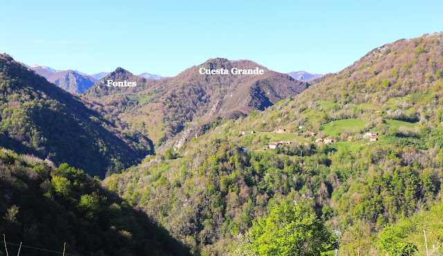 Dejando el coche al lado de la Fuente L'Ablanu en Quintanal, comenzamos el ascenso tomando la primera caleya del pueblo a la izquierda. Casas con arquitectura muy bonita y hórreos y paneras antiguas y hermosas. Las dejamos atrás y tomamos a la derecha , un ancho camino herboso - Camín de abajo- pasando por varias cuadras y en ascenso , dejando a nuestra izquierda Villar de Zuepos y San Esteban. Rodeamos por estrecho camino camperas y praderías ,tremendamente divididas, para llegar a un primer collado con cuadras cerradas La Chalga, con buenas vistas a la cordillera . De ahí nos vamos al Collado Espina desde el que vemos Brañavieja , ahora ya con casa remodelada y piscina. Tomamos una traza de cortafuegos y llegamos a la zona endorreica de las praderías de la Chana , por tanto con mucha agua rezumando por todos los lugares y comenzamos el ascenso por la zona más cercana a la cumbre hasta llegar al vértice, caseta y enorme jito de L'Horru, techo belmontino. Buena visibilidad y contemplación del paisaje. Comenzamos el descenso recorriendo la cresta hasta el collado existente al lado de la Vallinona donde un poco más a bajo paramos a tomar el bocata. Llegamos luego a la Chana y Brañavieja. Ahí tomamos un camino que va a la izquierda pasando por un montón de cuadras y prados, Braña de Quintanal, que tuvo que ser un hervidero...con camino empedrado y pasando por cuadras alguna aún en buen estado. Vamos viendo perspectivas hermosas del camín de Mesa y desde luego postales de San Esteban y Villar de Zuepos hasta llegar de nuevo a Quintanal, asearnos un poco , pararnos a hacer fotos de paneras y hórreos y seguir camino hasta Belmonte para tomar nuestras claras . Con un día así, el monte es un paraíso insustituible para nosotros.